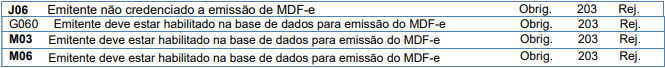 Rejeição 203: Emissor não habilitado para emissão do MDF-e (MDF-e)