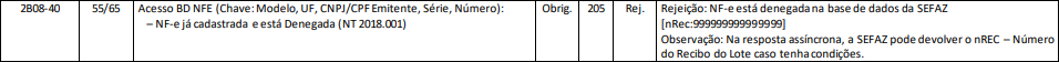 Quando for emitida uma NF-e (modelo 55), onde o CNPJ, série, número e modelo já foram denegados pela SEFAZ, irá retornar à rejeição 205.