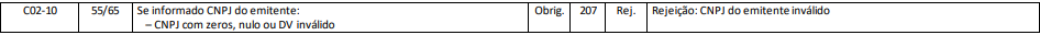 Quando for emitida uma NF-e (modelo 55) ou NFC-e (modelo 65), onde o CNPJ do emitente enviado no documento é inválido, irá retornar à rejeição 207.