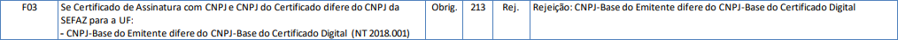 Quando um documento for emitido com um CNPJ-Base (CNPJ do emitente) diferente do CNPJ-Base do Certificado Digital, será retornado a rejeição.