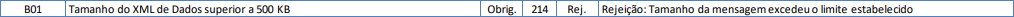 A aplicação do contribuinte não poderá permitir a geração de mensagem com tamanho superior a 512 Kb. Caso isto ocorra, a conexão poderá ser interrompida sem mensagem de erro se o controle do tamanho da mensagem for implementado por configurações do ambiente de rede do Ambiente Autorizador (ex.: controle no firewall). No caso de controle de tamanho ter sido implementado por aplicativo, teremos a devolução da mensagem de erro 214.