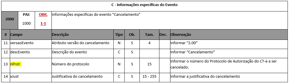 Para clientes que emitem o arquivo CT-e em TXT o campo nProt é referente a linha 2000 do evento de cancelamento e está localizado na 3º linha, conforme podemos visualizar abaixo nos manuais da NDD.