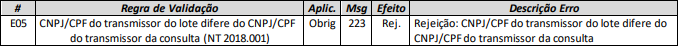 Rejeição 223: CNPJ/CPF do transmissor do lote difere do CNPJ/CPF do transmissor da consulta (NF-e)