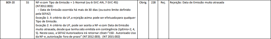 Quando for emitido um documento fiscal com tipo de emissão normal e data de emissão com atraso maior que 30 dias, contando a partir da data atual, ou acima de 24 horas se o documento estiver com tipo de emissão em EPEC, será retornado a rejeição.