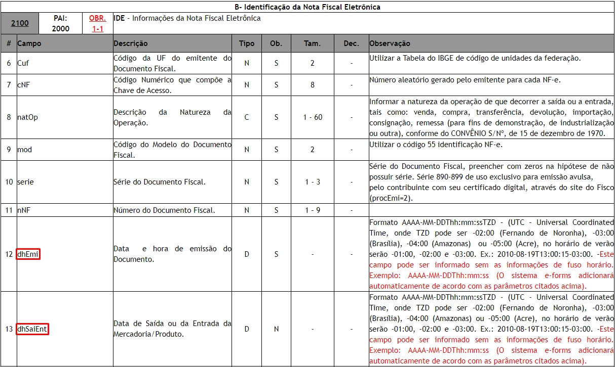 Para clientes que emitem o arquivo NF-e ou NFC-e em TXT o campo dhEmi e dhSaiEnt é referente a linha 2100. O campo dhEmi está localizado na 7º linha e o campo dhSaiEnt está localizado na 8º linha, conforme podemos visualizar abaixo nos manuais da NDD Tech.