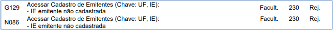 Quando for emitido um documento fiscal e a Inscrição Estadual (Campo: emit/IE) for válida e não estiver cadastrada na Sefaz Estadual, será retornado à rejeição.