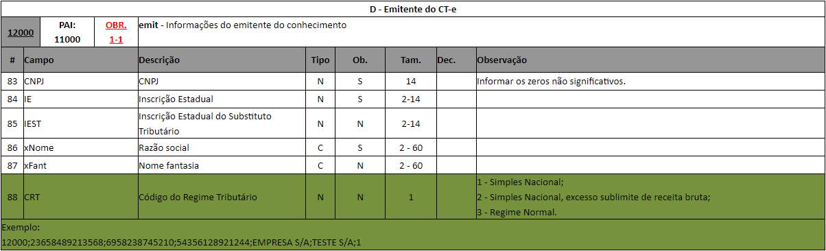 Para clientes que emitem o arquivo CT-e em TXT o campo emit é referente a linha 12000 e o campo CNPJ está localizado na 1 º linha, o campo IE está localizado na 2º linha, conforme podemos visualizar abaixo nos manuais da NDD.