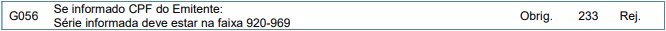 Essa rejeição ocorre quando o CPF do emitente está com a série incompatível.