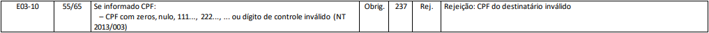 Quando for emitido um documento fiscal e o CPF do Destinatário (Campo: dest / CPF) for informado com apenas zeros, com sequência numérica incorreta ou dígito de controle (último número do CPF) inválido, será retornado à rejeição.