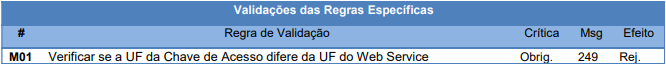 Essa rejeição ocorre ao emitir uma MDF-e, a mesma possui um código de UF inválido para a SEFAZ a qual está sendo enviada, ou seu código foi preenchido com o valor incorreto e em ambos os casos a rejeição 249 irá ocorrer.
