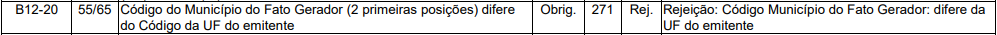 Essa rejeição ocorre quando no Código Município do Fato Gerador: difere da UF do emitente.