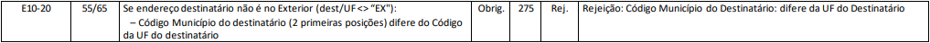 Quando for emitida um documento fiscal para destinatário localizado no Brasil (com UF diferente de EX - Exterior) e os dois primeiros dígitos do código do município for diferente do Código da UF correspondente a Sigla da UF informada nos dados do endereço do destinatário, será retornado à rejeição.
