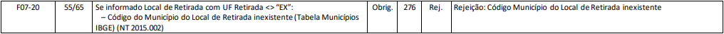 Essa rejeição ocorre quando no Código Município do Local de Retirada informado é inexistente.