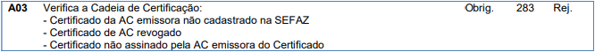 Essa rejeição ocorre quando o Certificado Transmissor está com Erro na Cadeia de Certificação.