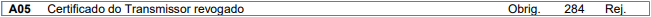 Essa rejeição ocorre quando o Certificado Transmissor está incluso na lista de Certificados Revogados (LCR), que é disponibilizada pelas Certificadoras.
