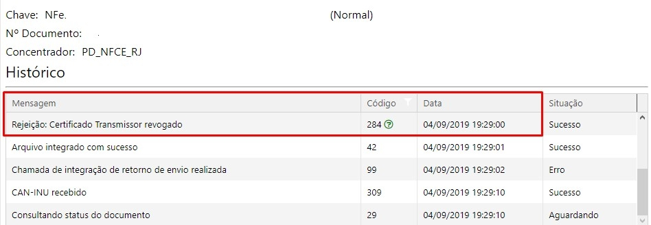 Verificar a razão pela qual o Certificado Transmissor está revogado, será preciso substituí-lo por um Certificado válido.
