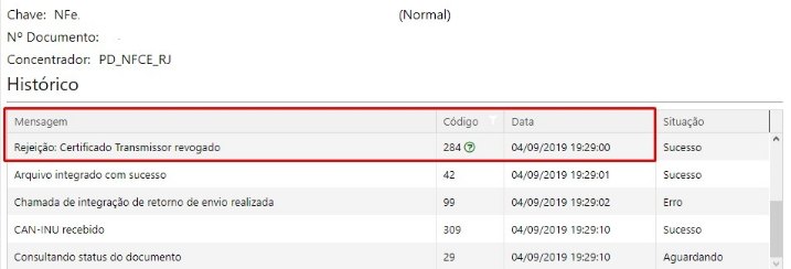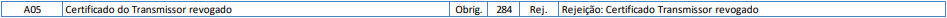 Essa rejeição ocorre quando o Certificado Transmissor está incluso na lista de Certificados Revogados (LCR), que é disponibilizada pelas Certificadoras.