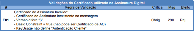 Certificado de Assinatura inexistente na mensagem (*validado também pelo Schema)