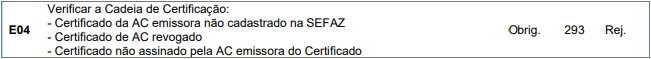 Essa rejeição ocorre quando o Certificado de Assinatura está com erro na Cadeia de Certificação.