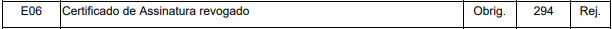 Essa rejeição ocorre quando o Certificado de Assinatura está incluso na lista de Certificados Revogados (LCR), que é disponibilizada pelas Certificadoras.