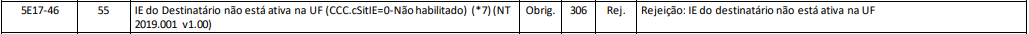 Quando for emitida uma NF-e onde a IE do destinatário não está ativa na UF, neste caso irá retornar a rejeição 306.