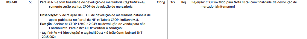 Rejeição 327: CFOP inválido para Nota Fiscal com finalidade de devolução de mercadoria (NF-e)