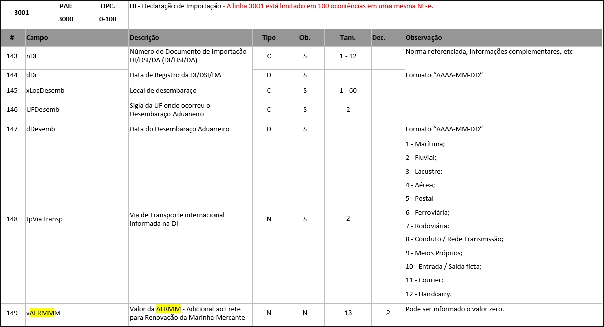 Para clientes que emitem o arquivo em TXT a tag tpViaTransp é referente a linha 3001 no 6º campo e a tag vAFRMM está localizado no 7º campo, conforme podemos visualizar abaixo nos manuais da NDD Tech.