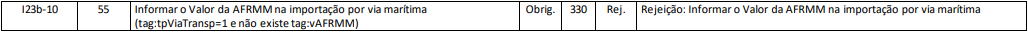 Essa rejeição será apresentada quando for informado o valor da AFRMM na importação por via marítima (tag:tpViaTransp=1) e não for informado a tag vAFRMM no arquivo de envio.