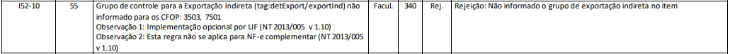 Rejeição 340: Não informado o grupo de exportação indireta no item (NF-e)