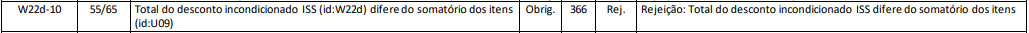 Verificar pois o Total do valor de desconto incondicionado ISS (id:W22d) difere do somatório dos itens (id:U09).