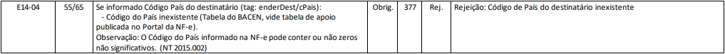 Rejeição 377: Código de País do destinatário inexistente (NF-e)