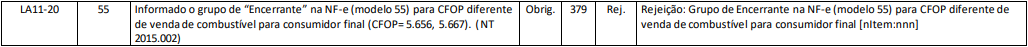 Essa rejeição ocorre quando for emitida uma NF-e com o Grupo de Encerrante, onde no Detalhamento Específico de Combustível e o CFOP for diferente de “5.656” ou “5.667”.
