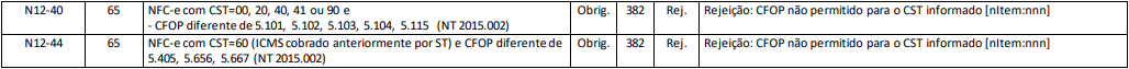Essa rejeição ocorre quando for emitida uma NFC-e com CST de ICMS igual a 00, 20, 40, 41 ou 90 e o CFOP for diferente de um da lista abaixo: