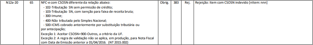 Essa rejeição ocorre quando for emitida uma NFC-e com Código de Situação da Operação - Simples Nacional (CSOSN) diferente da lista abaixo: