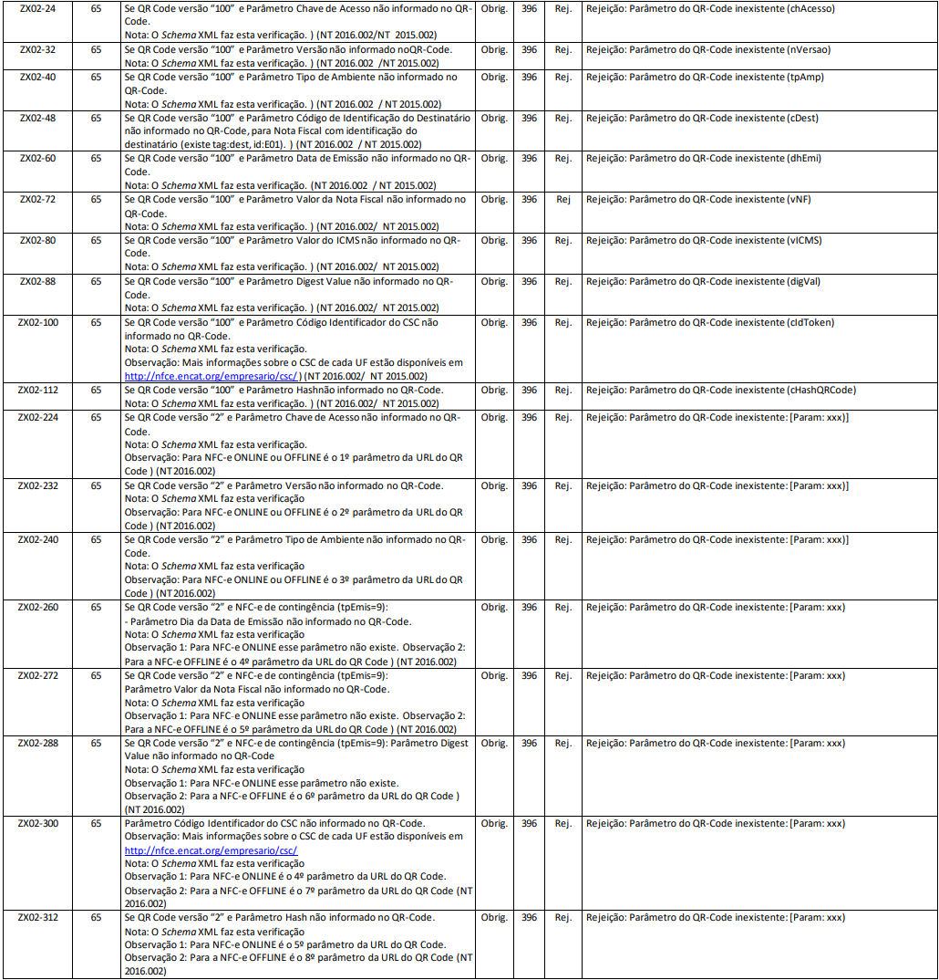 Rejeição 396: Parâmetro do QR-Code inexistente: [Nome do parâmetro do QR Code: xxx)] (NFC-e)
