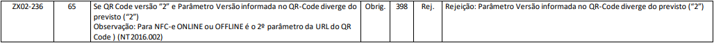 Essa rejeição ocorre quando for emitida uma NFC-e e o parâmetro “Versão” do QR-Code está diferente de 2.