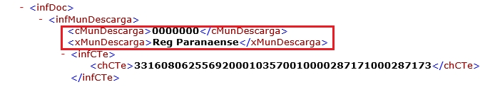 Informar um nome de cidade Válido e seu código de Município para descarregamento do MDF-e, como no exemplo abaixo.