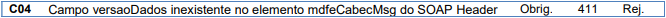 Rejeição 411: Campo versaoDados inexistente no elemento mdfeCabecMsg do SOAP Header (MDF-e)