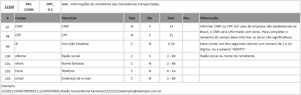 Para clientes que emitem o arquivo em TXT a tag IE do remetente é referente a linha 12100 no 3º campo, conforme podemos visualizar abaixo nos manuais da NDD.