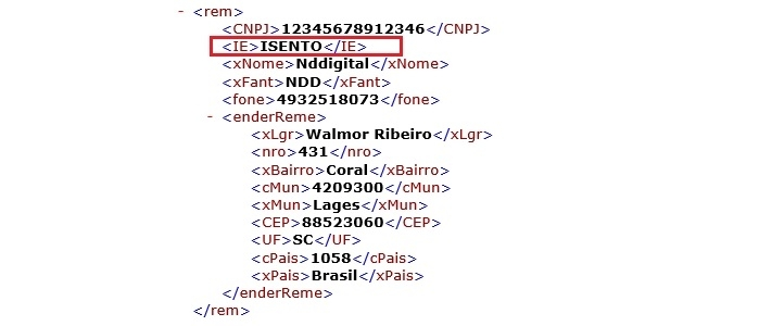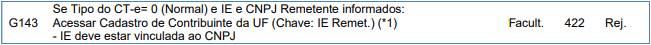 Quando for informado no arquivo de envio a tag (rem) com as informações do Remetente e for informado uma IE (Inscrição Estadual) inválida ou incorreta ou se for informado como ISENTO, sendo que possui cadastro de IE, retornará a rejeição.
