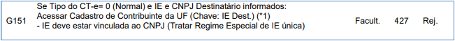 Quando for emitido um CT-e, e a Inscrição Estadual do Destinatário (Campo: dest / IE) informado não estiver vinculado ao CNPJ (Campo: dest / CNPJ) do mesmo, será retornado à rejeição.