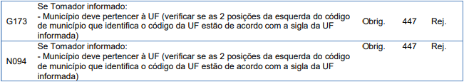 Essa rejeição ocorre quando o Código de Município difere da UF de localização tomador.