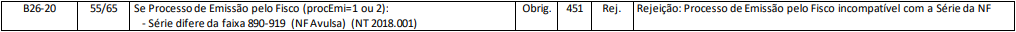 Essa rejeição ocorre ao emitir uma NF-e (modelo 55). Caso o processo de emissão for realizado pelo Fisco (procEmi=1 ou 2) e a série informada difere da faixa 890-919 (NF Avulsa).