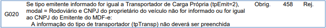 Rejeição 458: Tipo de Transportador não deve ser informado para Emitente de Carga Própria proprietário do veículo (MDF-e)