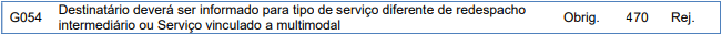 Essa rejeição ocorre quando o Destinatário deverá ser informado para tipo de serviço diferente de redespacho intermediário ou Serviço vinculado a multimodal.