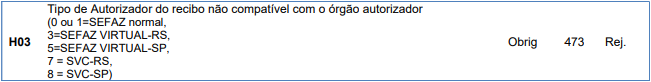 Essa rejeição ocorre quando o Tipo Autorizador do Recibo difere do Órgão Autorizador.
