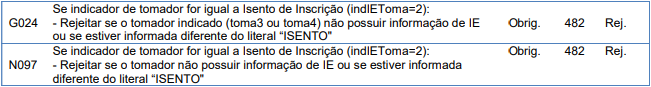 Rejeitar se o tomador indicado (toma3 ou toma4) não possuir informação de IE ou se estiver informada diferente do literal “ISENTO".