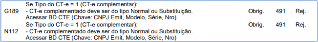 Rejeição 491: CT-e complementado é diferente de Normal ou Substituição (CT-e)