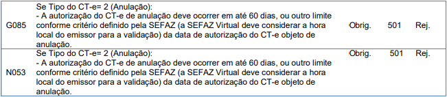 Rejeição 501: Autorização do CT-e de Anulação deve ocorrer em até 60 dias da data de autorização do CT-e objeto de anulação (CT-e)