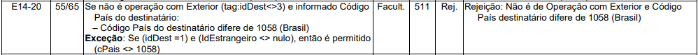 Rejeição 511: Não é de Operação com Exterior e Código País destinatário difere de 1058 (Brasil) (NF-e)